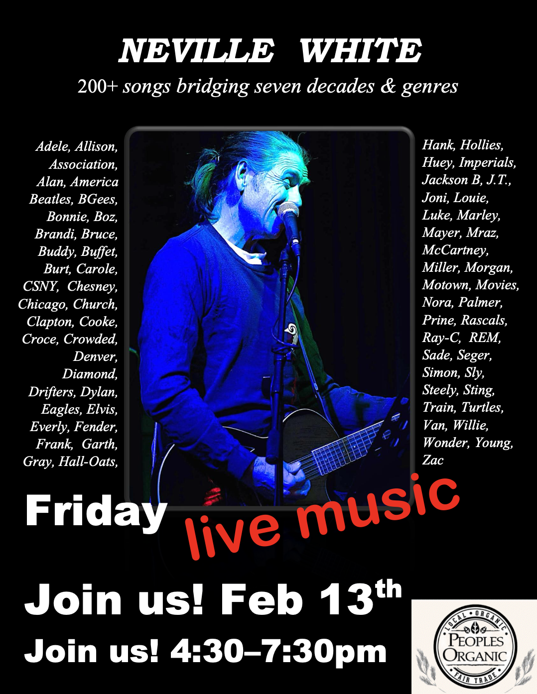 Join us over cocktail or dinner with Neville White 4:30-7:30p3 hrs | 2026-02-13T16:30Free